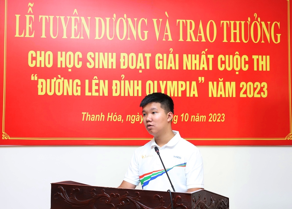 Phát biểu tại buổi Lễ, em Lê Xuân Mạnh chia sẻ: “Để đạt được ngôi vị Quán quân Olympia đầu tiên cho tỉnh nhà và vinh dự được có mặt trong buổi Lễ tuyên dương khen thưởng hôm nay, thực sự không hề dễ dàng. Đó là một hành trình dài đầy khó khăn, phải vượt qua những vất vả đầy áp lực và lo lắng. Nhưng rất may mắn cháu đã được BGH nhà Trường THPT Hàm Rồng tạo điều kiện tốt nhất về kế hoạch, chiến lược, ủng hộ hoàn toàn về thời gian; thầy cô sát sao hỗ trợ về tri thức. Đặc biệt là những người bạn trong Câu lạc bộ Olympia, những cố vấn tận tâm, bè bạn nhiệt tình, người thân và cả xã hội quan tâm động viên kịp thời để cháu vượt qua và yên tâm ôn tập.