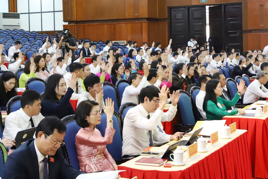 Đại biểu HĐND tỉnh khóa XIX biểu quyết thông qua nghị quyết tại kỳ họp.